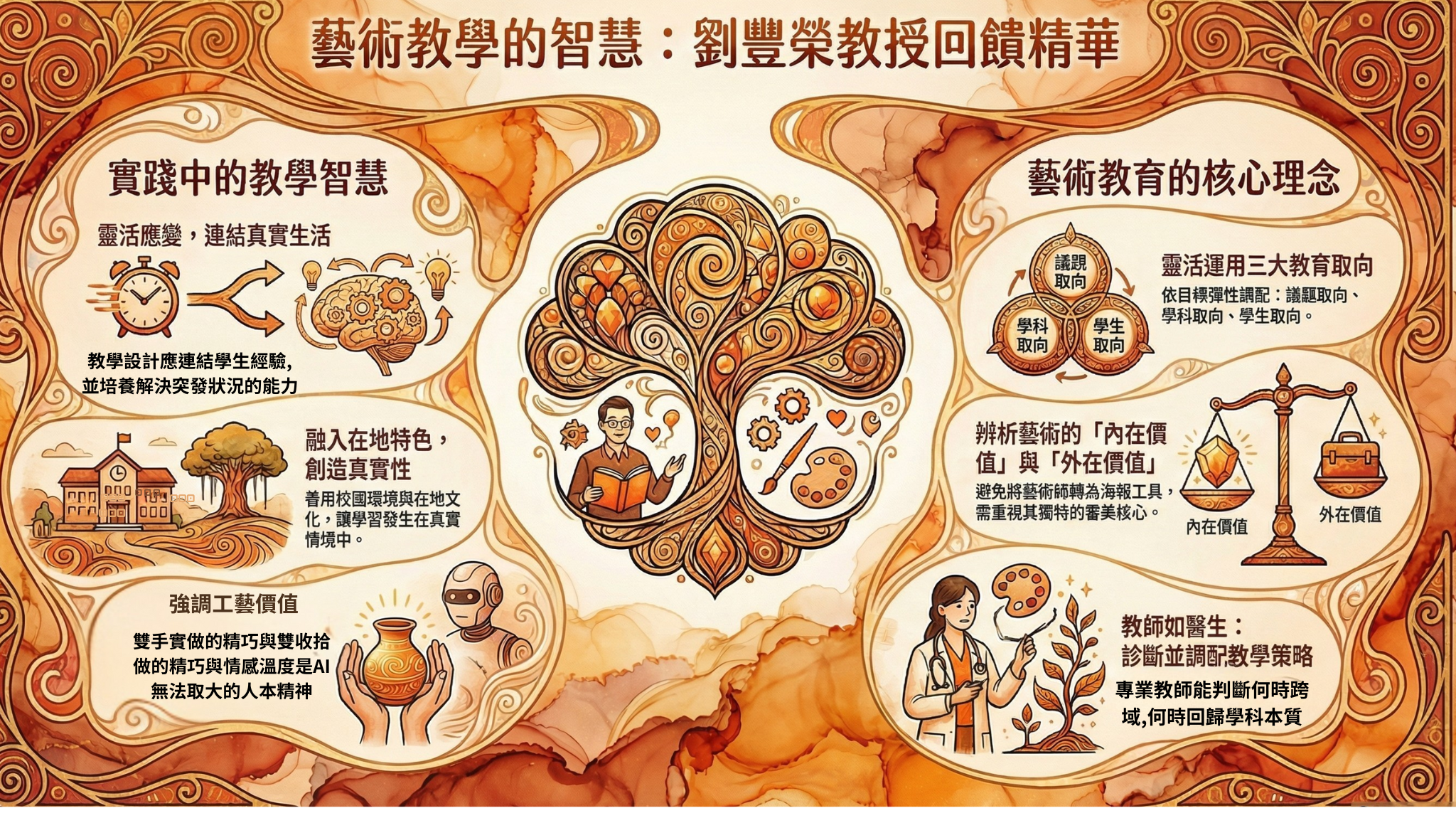 - 警惕「海報化」現象: 教授觀察到進行美育之跨域時,往往會流於將美術變成僅占邊緣地位,如為其他學科之學習做插圖或海報,而稀釋了藝術的本質與內在價值。