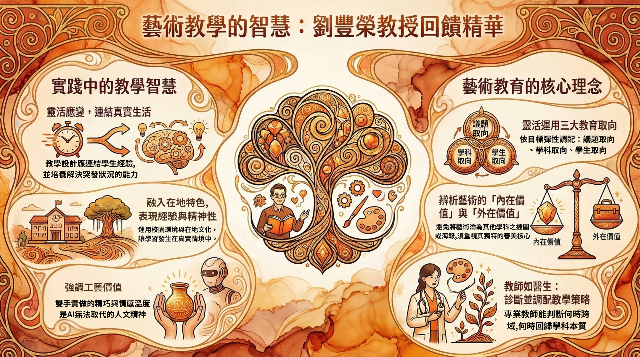 - 警惕「海報化」現象: 教授觀察到進行美育之跨域時,往往會流於將美術變成僅占邊緣地位,如為其他學科之學習做插圖或海報,而稀釋了藝術的本質與內在價值。