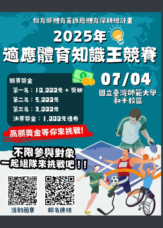 二、為推廣適應體育知能,鼓勵教育從業人員與社會大眾主動學習適應體育知識並落實日常生活實踐,教育部體育署委請國立臺灣師範大學辦理旨揭活動。