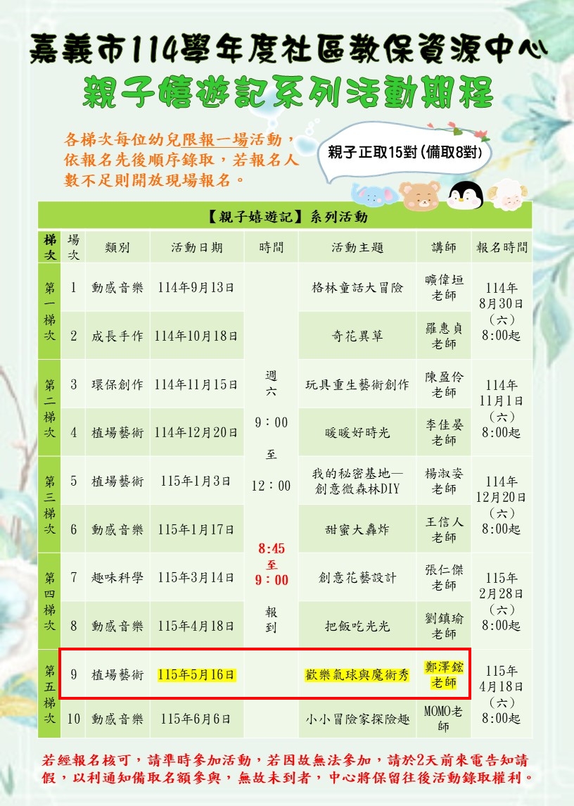 原115年5月2日 第五梯次 植場藝術活動,因遇到5/1勞動節連假,故當週中心暫停開放,並將活動時間調整為「115年5月16日」