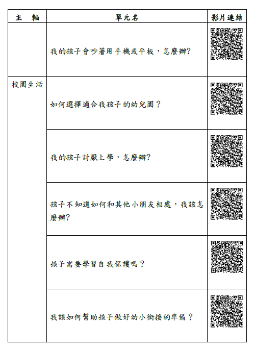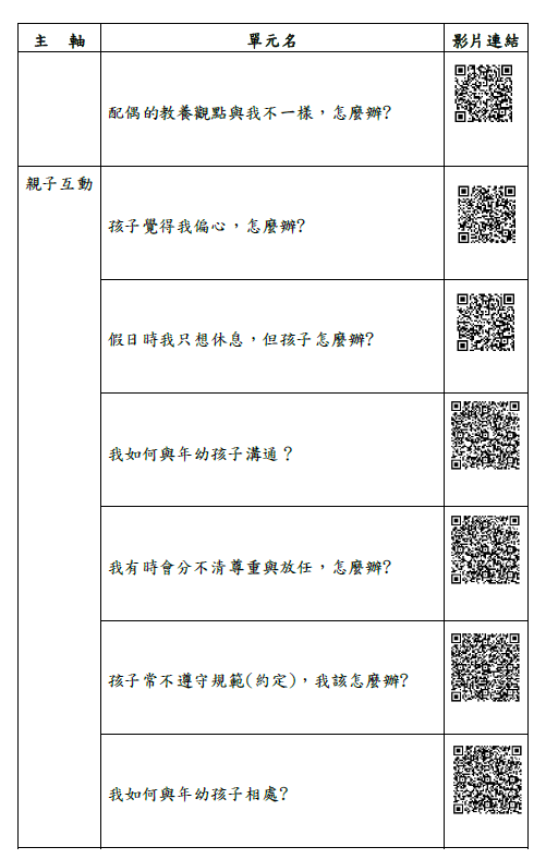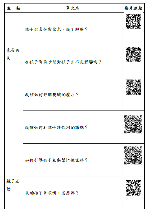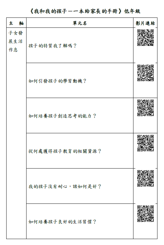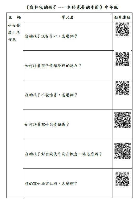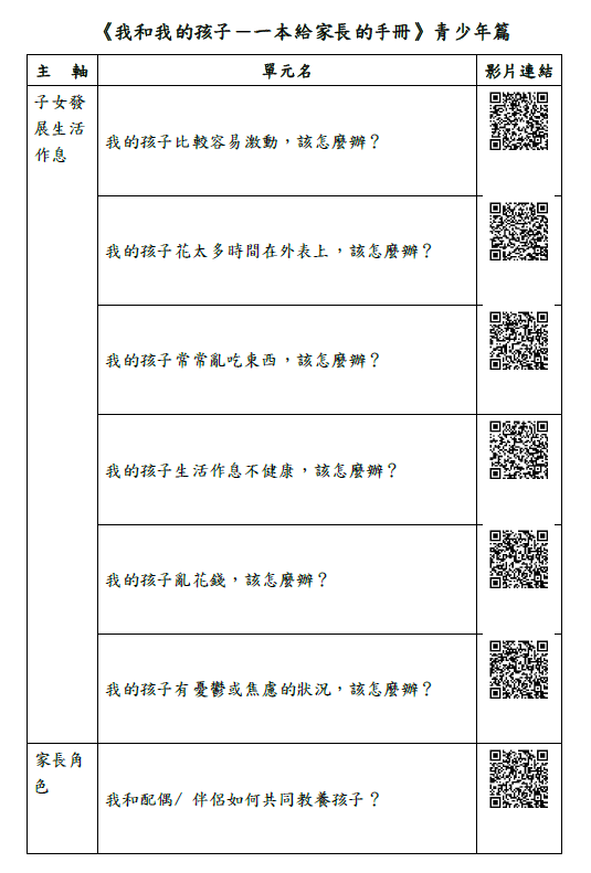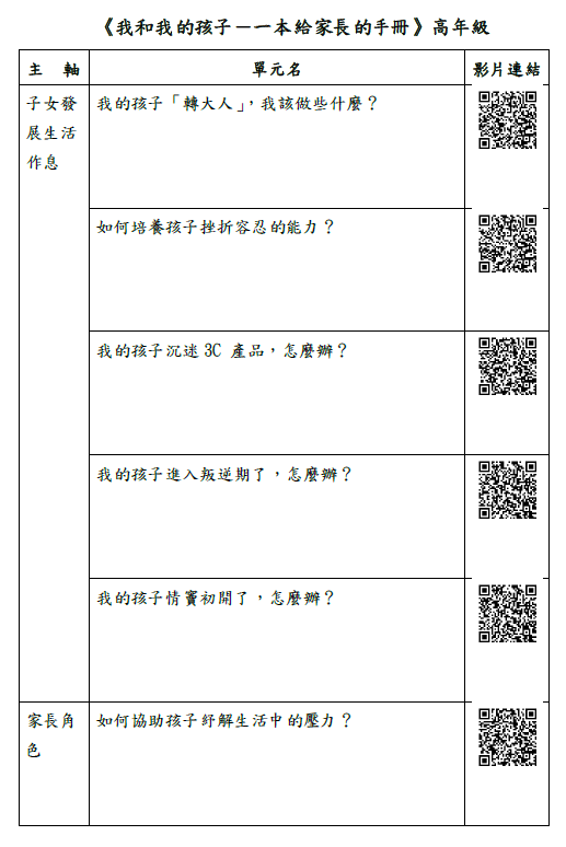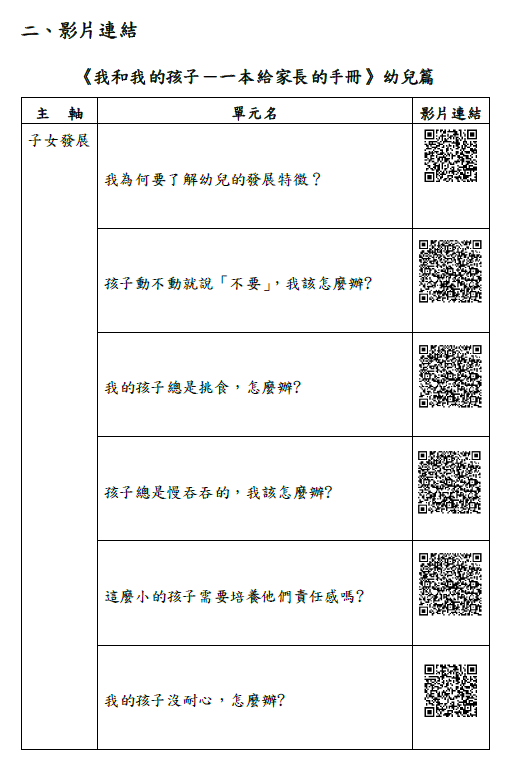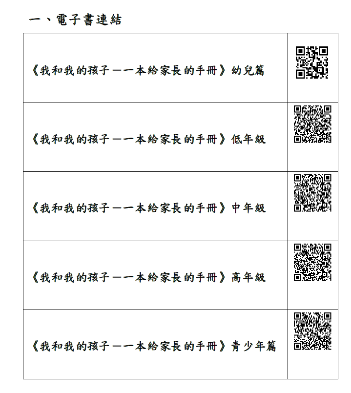 《我和我的孩子》親職教育系列手冊針對家有學前孩、國小生及青少年階段的家長,設計幼兒篇、國小篇(低、中、高年級)及青少年篇共有5冊,上架在教育部家庭教育資源網-社會大眾學習資源專區,電子書與影片連結整理如下,歡迎推廣及使用。