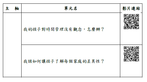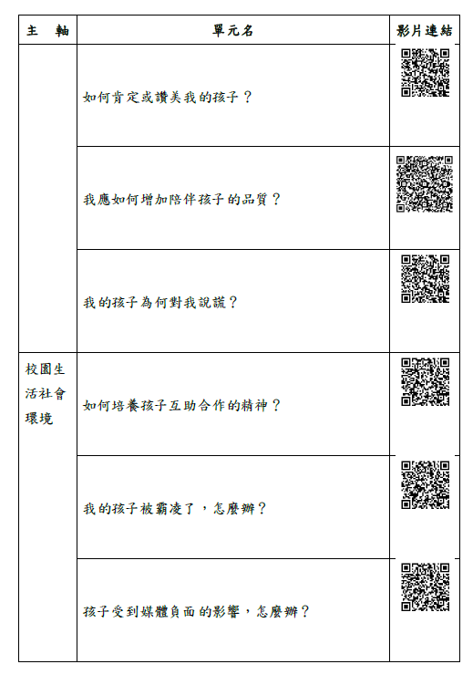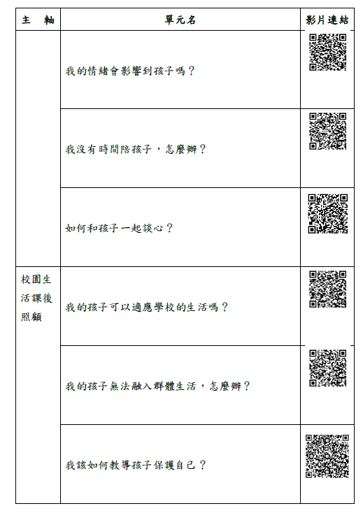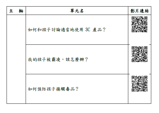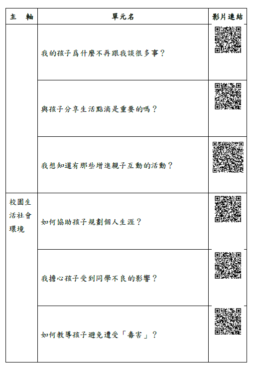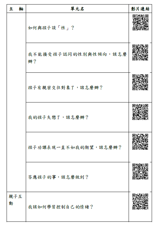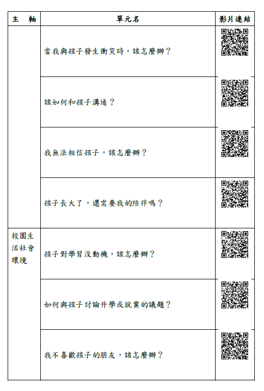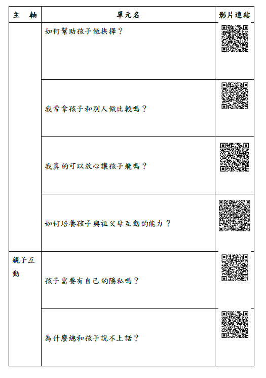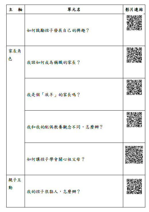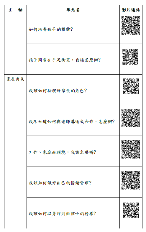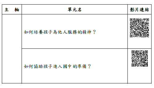 《我和我的孩子》親職教育系列手冊針對家有學前孩、國小生及青少年階段的家長,設計幼兒篇、國小篇(低、中、高年級)及青少年篇共有5冊,上架在教育部家庭教育資源網-社會大眾學習資源專區,電子書與影片連結整理如下,歡迎推廣及使用。